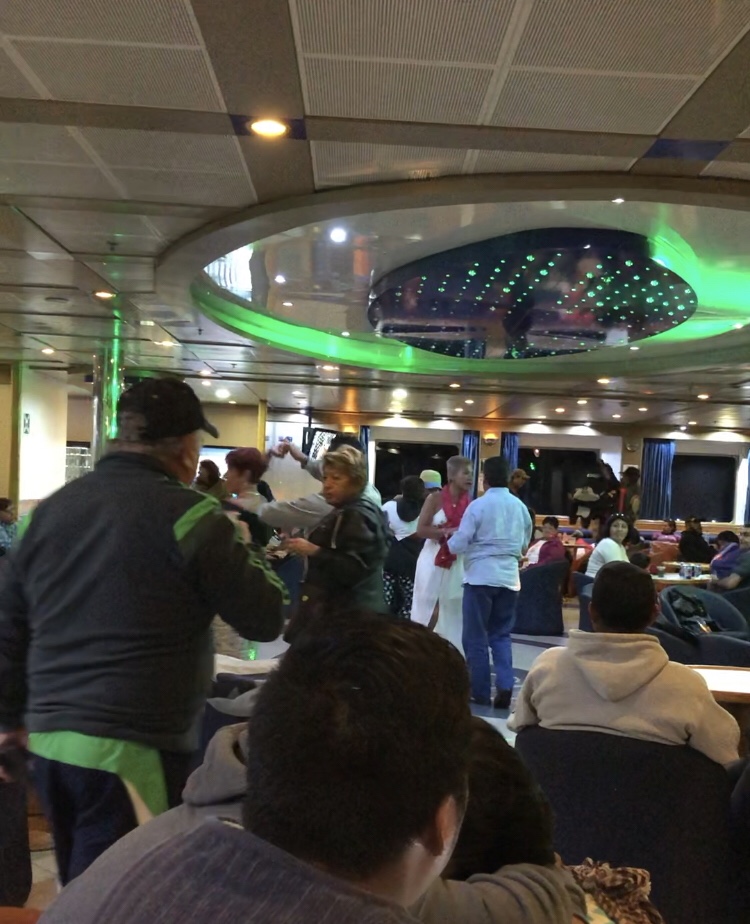 After the chaos of getting in all the wrong lines, and being redirected all over the ferry terminal, finally boarding and finding each other, this scene was the last thing we expected ha! Couples all over the dance floor, a live band and DJ.