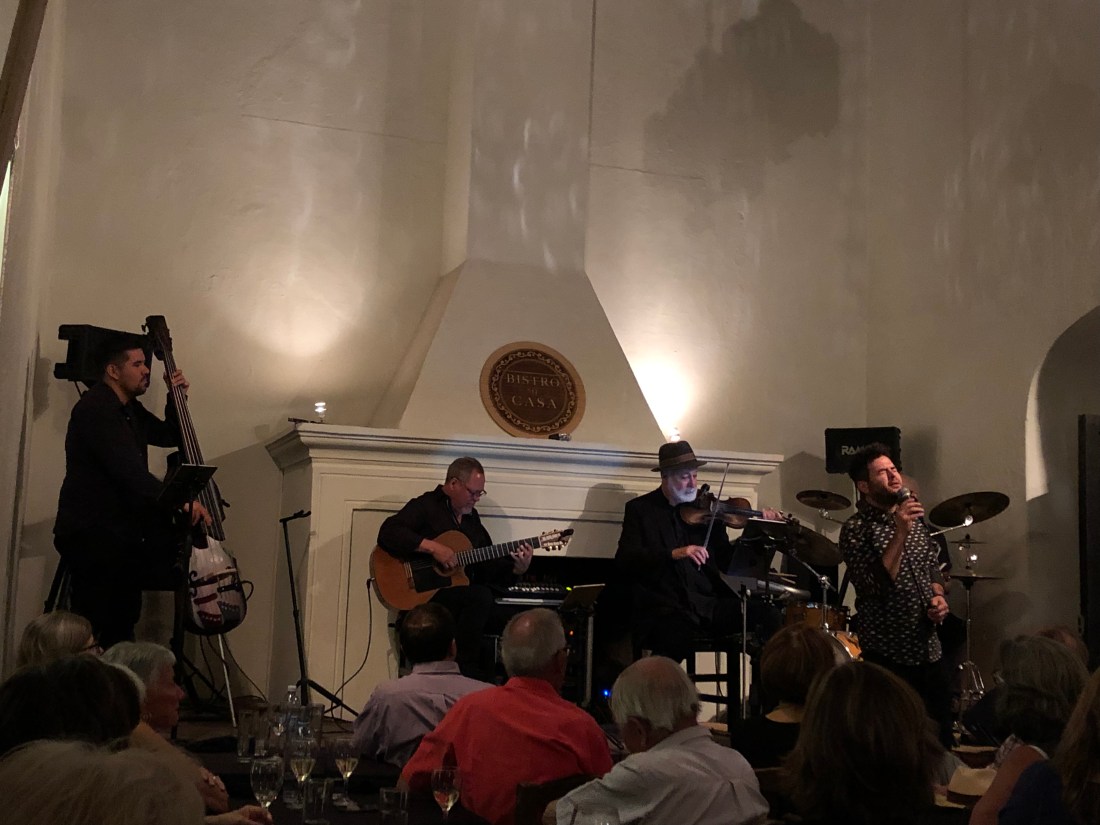 Staring (and chewing) in awe as Carnegie hall guitarist Gil Gutiérrez takes the stage over chiles en nogadas at Bistro Mi Casa.